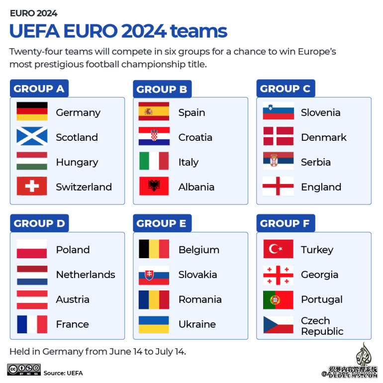 为期一个月的锦标赛将于6月14日在慕尼黑足球场开赛,东道主德国队对阵苏格兰队。