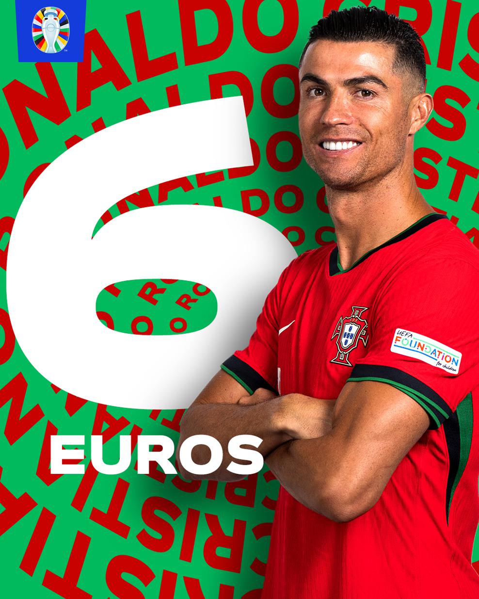 克里斯蒂亚诺·罗纳尔多(葡萄牙 2004 年、2008 年、2012 年、2016 年、2020 年、2024 年)